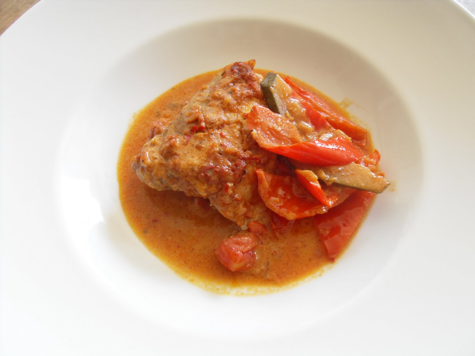 In a deep pan season and seal your chicken then cover with the marinade. Saute the pepper and courgette and loosen up (deglace) with a little chicken stock. Bop the marinaded chicken in with the peppers and courgettes. At this stage you can sling in some cream/yogurt. Cover your pan with tin foil, oven on full, cook out for roughly 25-30 minutes. Periodically take the pan out and baste your chicken, there will be a lot of liquid as the pepper and courgette give up there water during the cooking.
