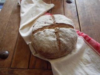 Don’t knead this as it will make it heavy – just bring it together in a big soft ball then flatten into what looks like a big round beer mat about 1 inch in height. Slash it with a knife in a cross fashion and then whack it in a really hot oven straight away – 25-35 minutes later and your done.