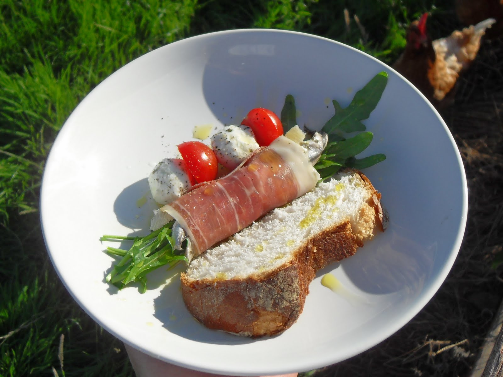 First sort out the anchovies, they usually come already oiled but I find adding garlic, lemon juice and flat leaf parsley really brings them up.Crumble some hard cheese and cut a doorstep of bread.
