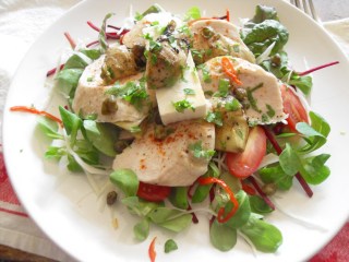 Arrange the leaves and assorted veg on a clean white plate and drizzle with whatever dressing you feel like – my own preference is 3 parts Oil, 1 part Lemon Juice, Dried oregano, 1 tps Dijon mustard, salt and pepper to season. Put all of these into a small jam jar and shake up well.