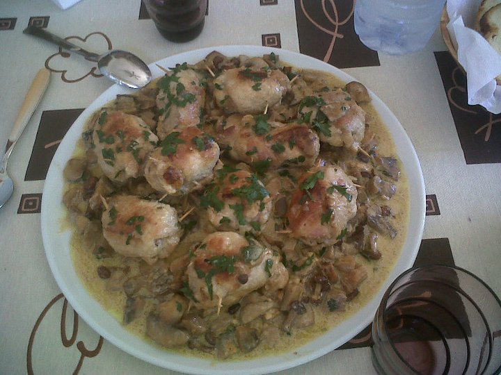 In the same pan sling in the garlic and sliced shallots and brown a little, sling in teh wine and ‘scrape’ around the pan, now in with the mushroom (strain the liquid you soaked the Porcini in and sling it in also). You can now reduce the heat to a medium and put the chicken back in along with the Oregano. Mix things around a bit and now in with the cream – about enough to come 3/4’s the way up the chicken, put the lid on and leave for about 20minutes.