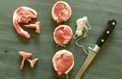To turn the lamb in ‘Noisettes’ you need to extract the bone which is part spine part rib, have a look at the pic above and you can see the bone extracted – you literally just cut it out with the point of the knife leaving the meat and fat behind. You then wrap the piece of loose meat that looks like a tail back around the main fillet to create a dainty little circle. Its then just a simple case of either stringing or sticking (butchers string or cocktail stick) the noisette to maintain its shape during cooking.