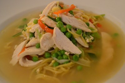 Bounce off by bringing the chicken broth to a rolling simmer and sling in the chicken – let it gently cook out for 10-15 minutes or until the chicken is cooked through. Remove, cool and shred, sling back into the broth along with the pepper, spring onion, noodles, peas, chili and ginger.