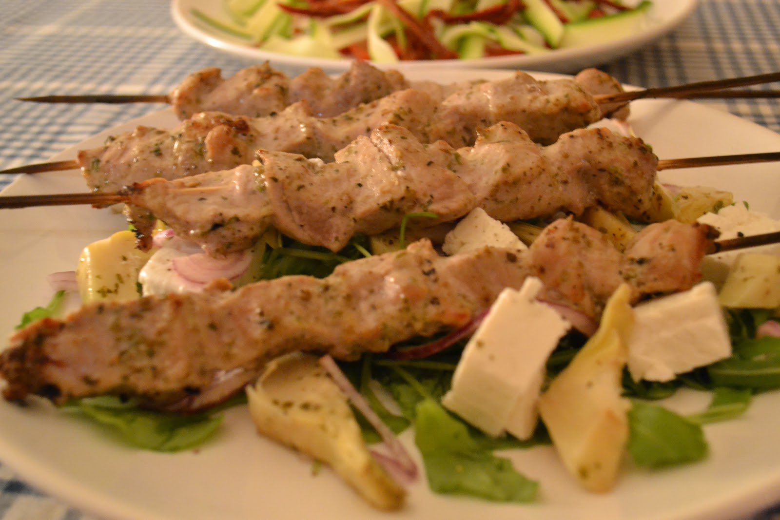 Serve the Souvlaki on a fresh leaf salad with sun dried tomatoes and artichoke hearts.