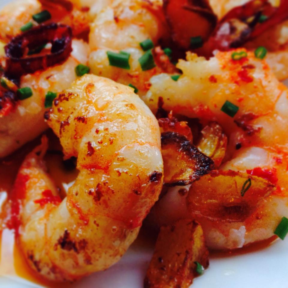 Step2: Sling the Chili oil into the pan and get it smokin’ hot then in with you prawns, season and keep moving constantly around the pan. At this stage feel free to sling in some booze, Japanese rice wine works pretty well, flame it.