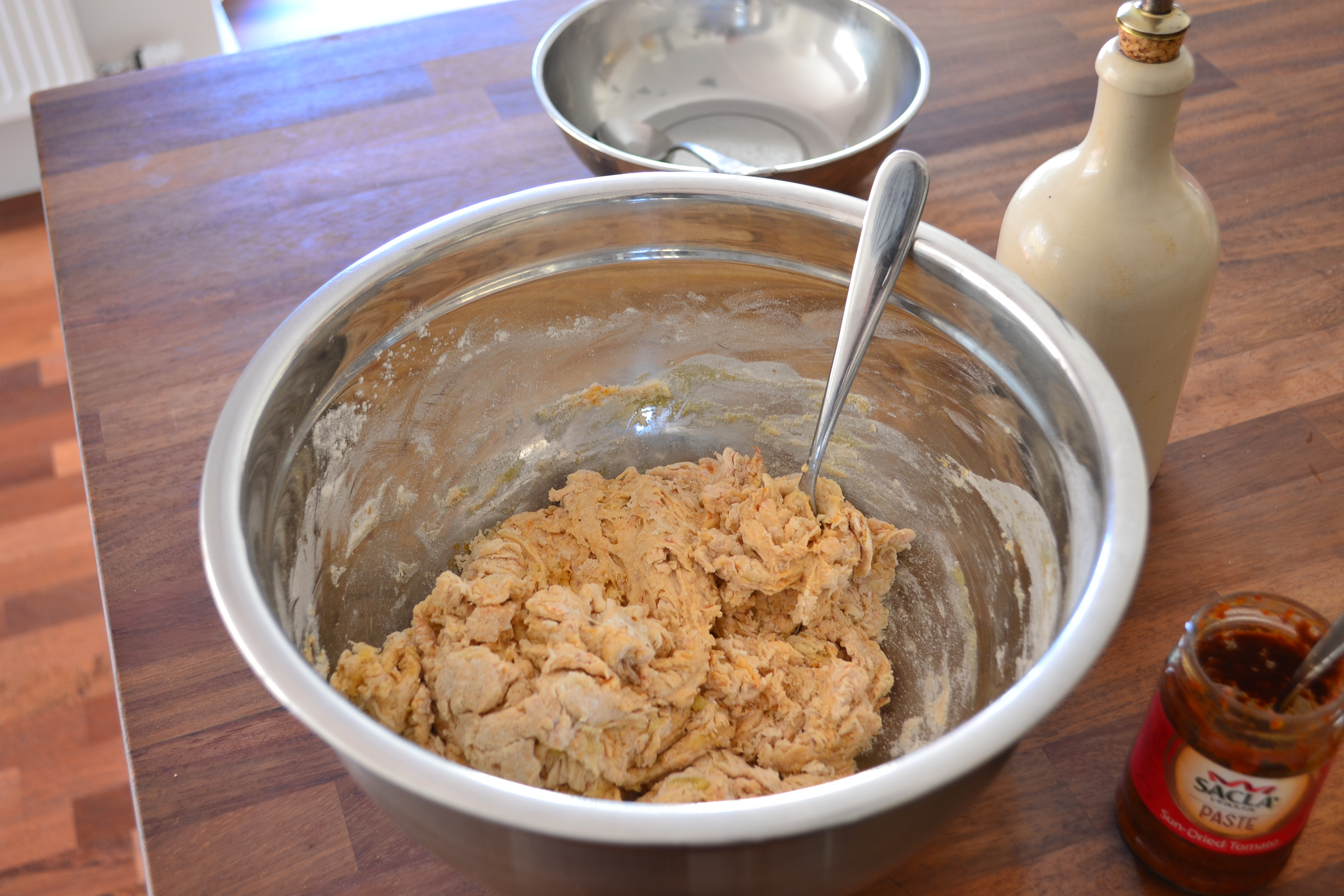 Add the yeast and water to the flour and then in with the tomato pesto and oil – with well with a fork to form a dough