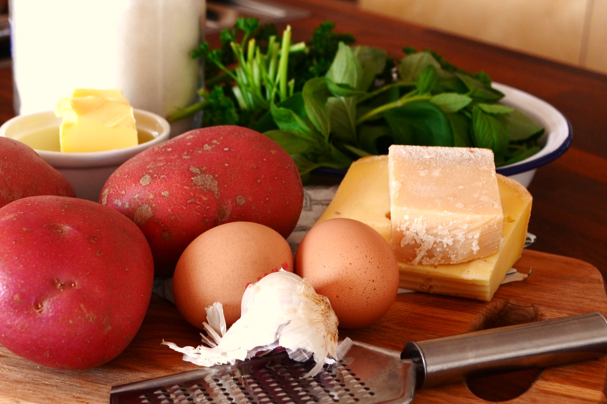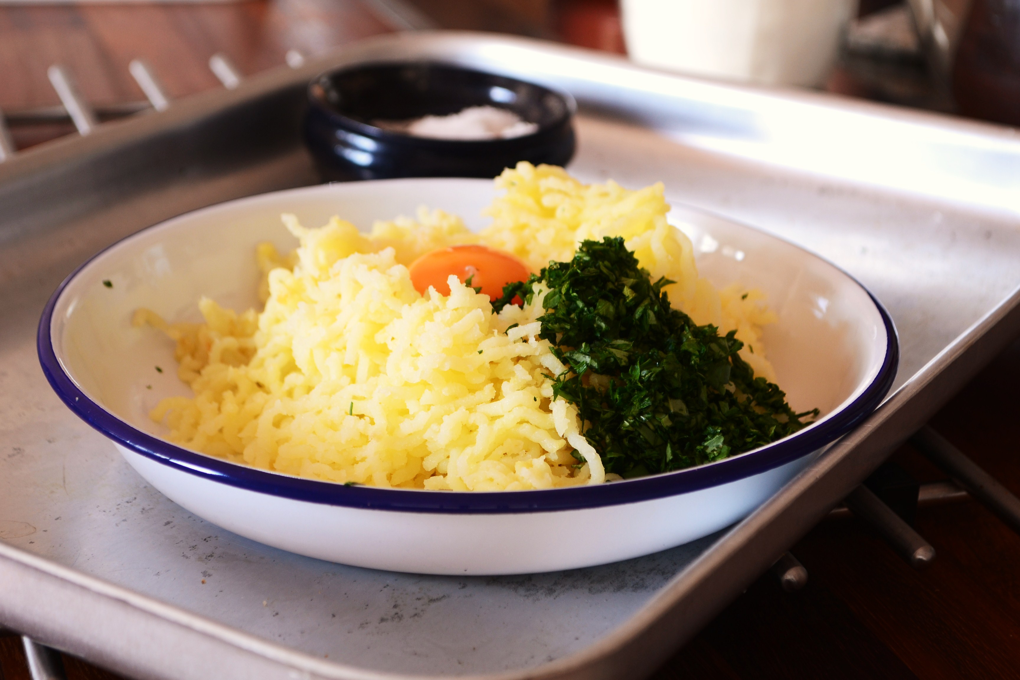 Combine the spuds with the egg and herbs and season really well – taste the mix and adjust as you need.