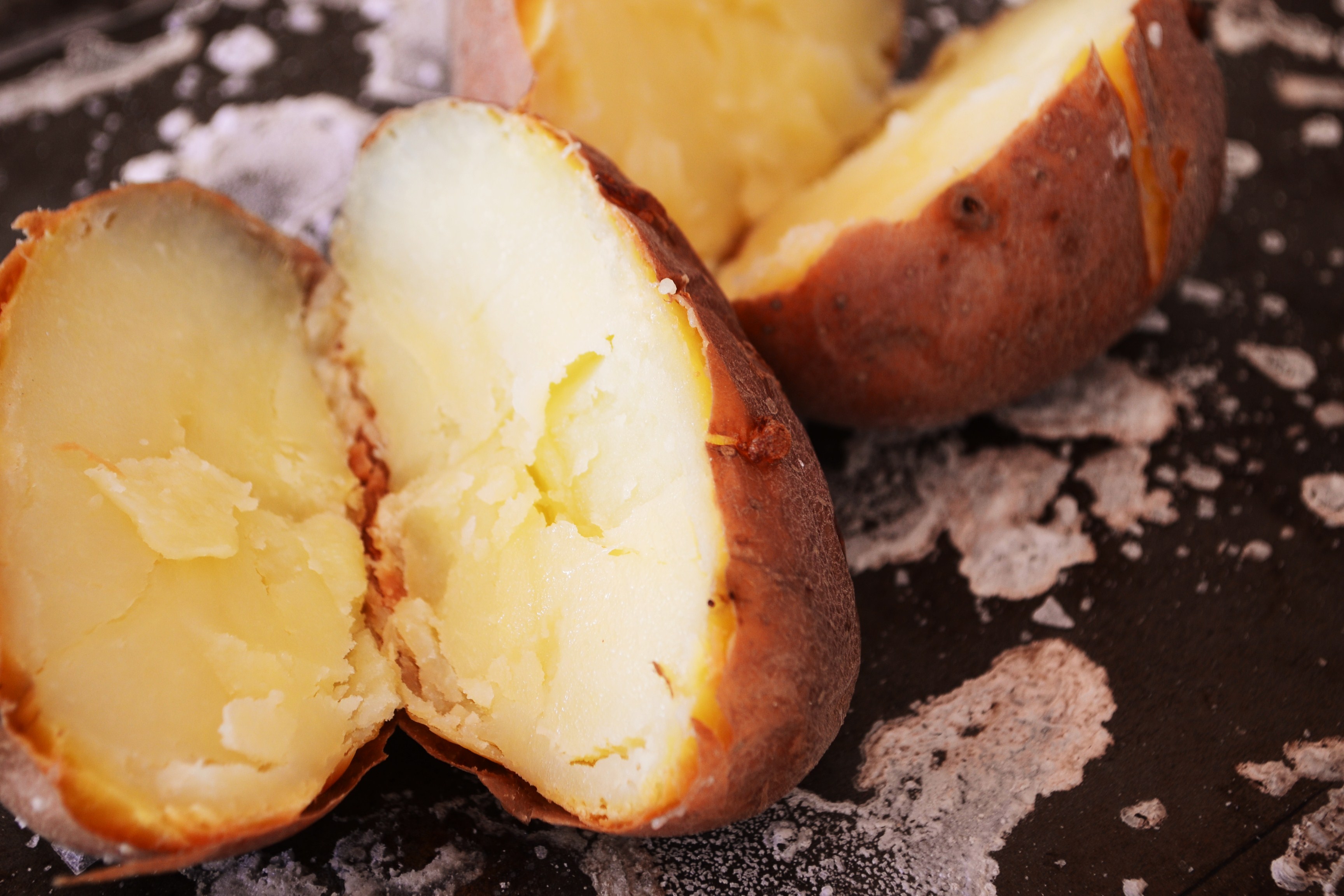 Split the spuds in half and scoop out the flesh – do not get rid of the skins, deep fry them and serve with sour cream and sweet chili sauce……but that’s for another time 😉