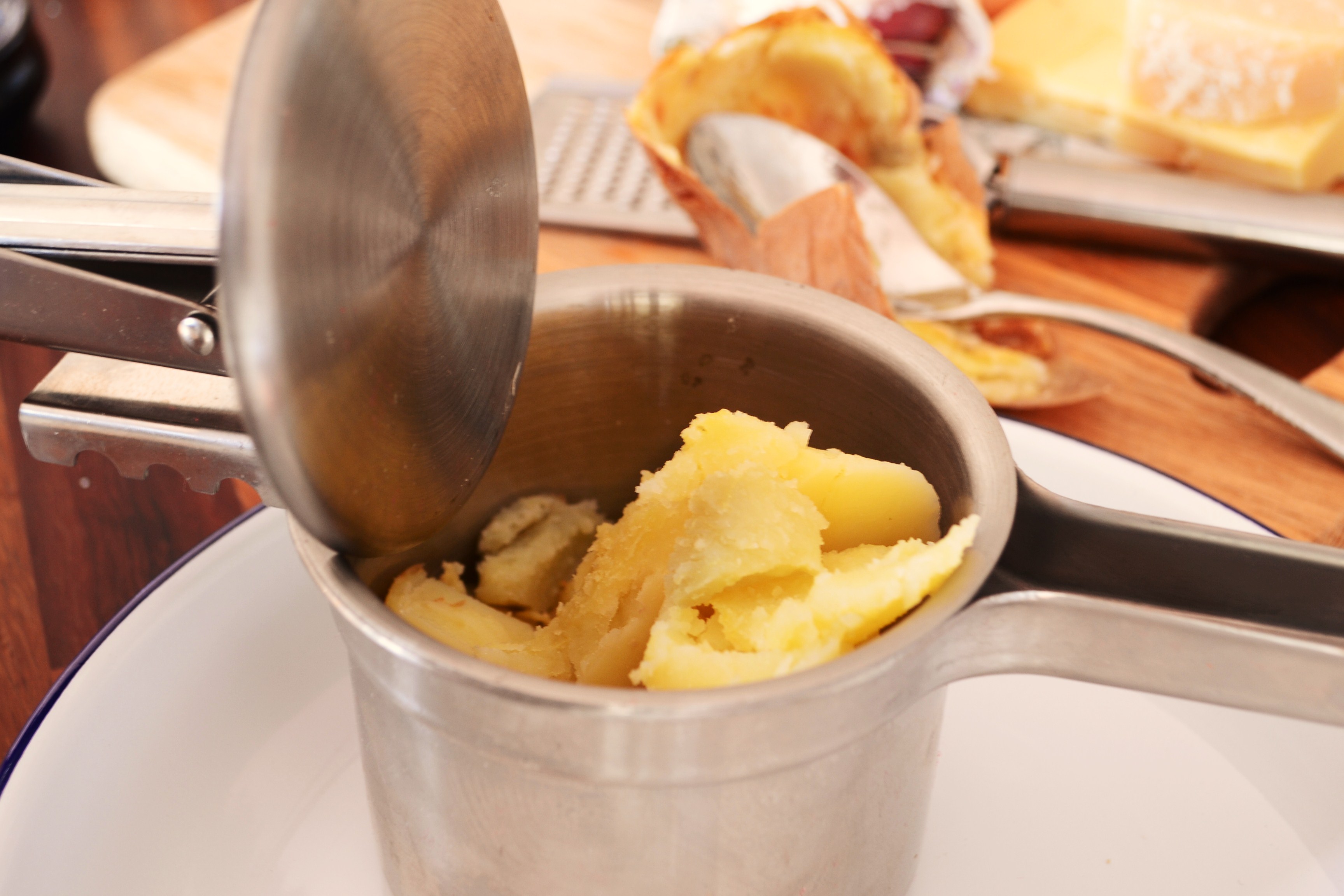 Next, don’t just mash the spuds you gotta rice them or sling them through a mouli – this is the next step in getting light gnocchi