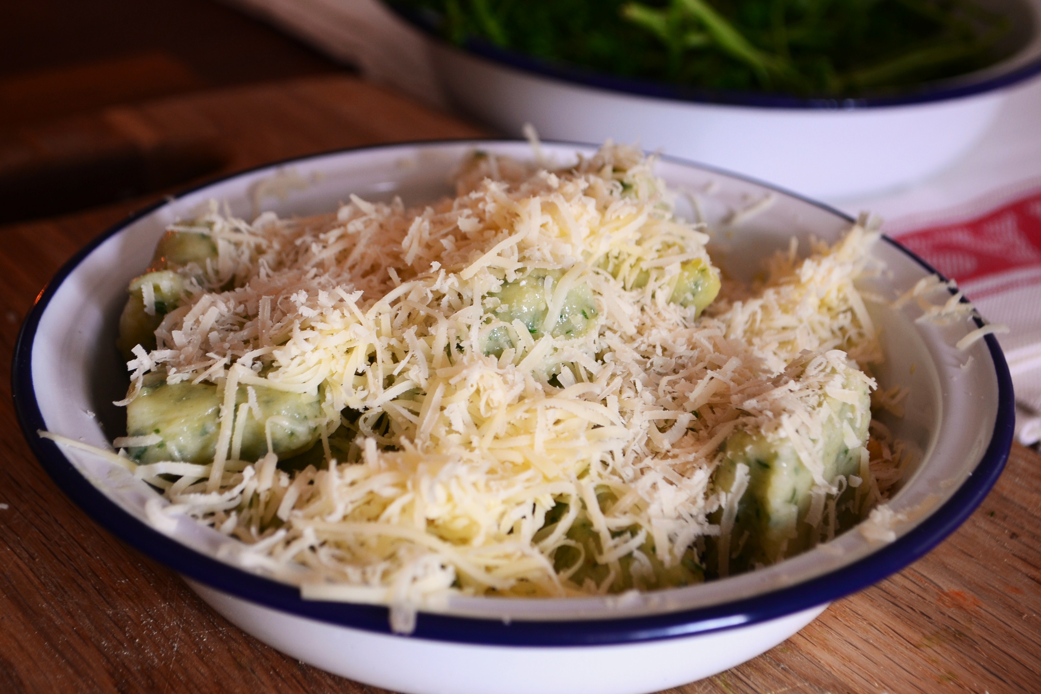 Drain the gnocchi and arrange in whatever dish you are serving in then scatter over the freshly grated cheeses and sling under a grill until the cheese melts and is gooey. Eat immediately!
