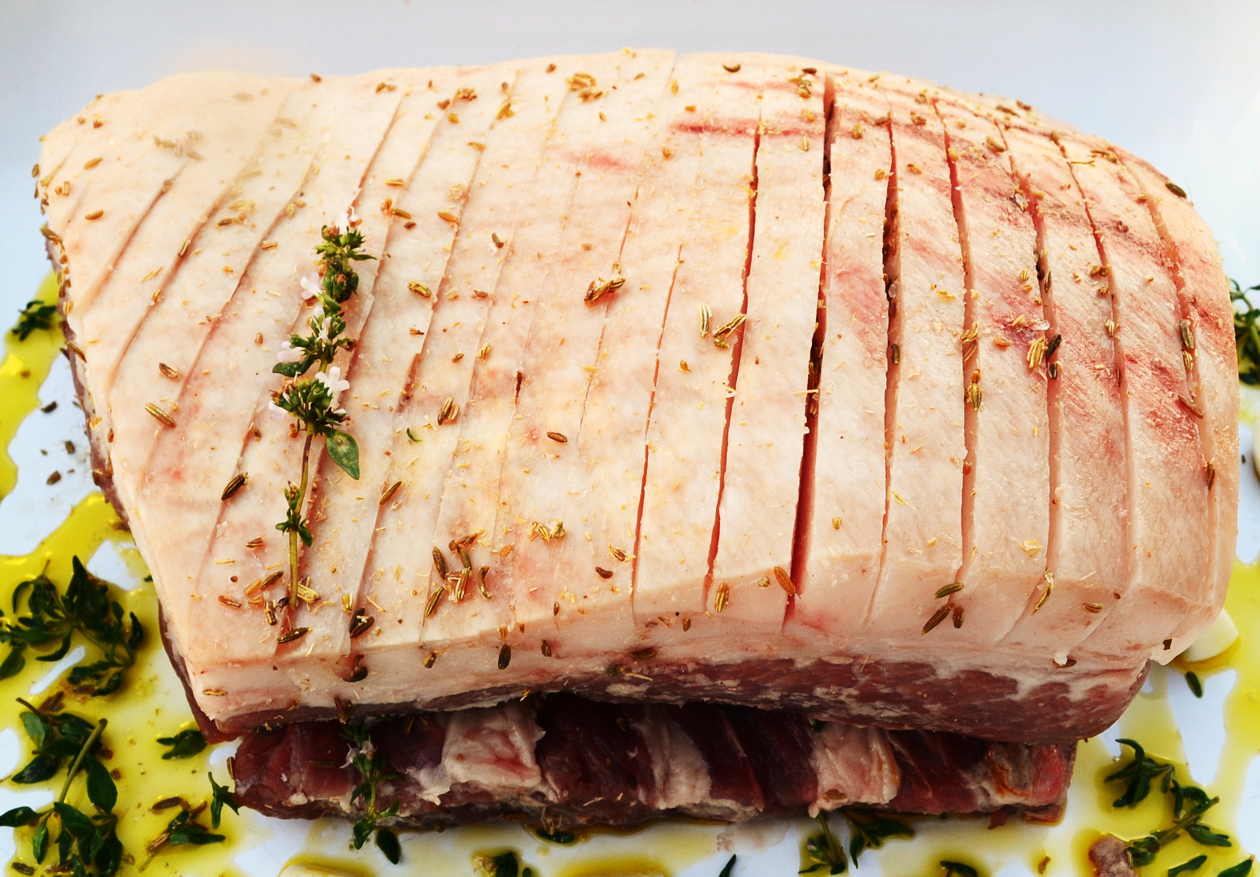 Step1: Start by scoring the skin at 1 cm intervals with a very, very sharp knife, work  parallel  to the pork belly edges all the way down to the top layer of fat. If you are able to then carefully remove the rack of ribs from the belly, you will use them as a trivot when roasting but your butcher can do this if needed.